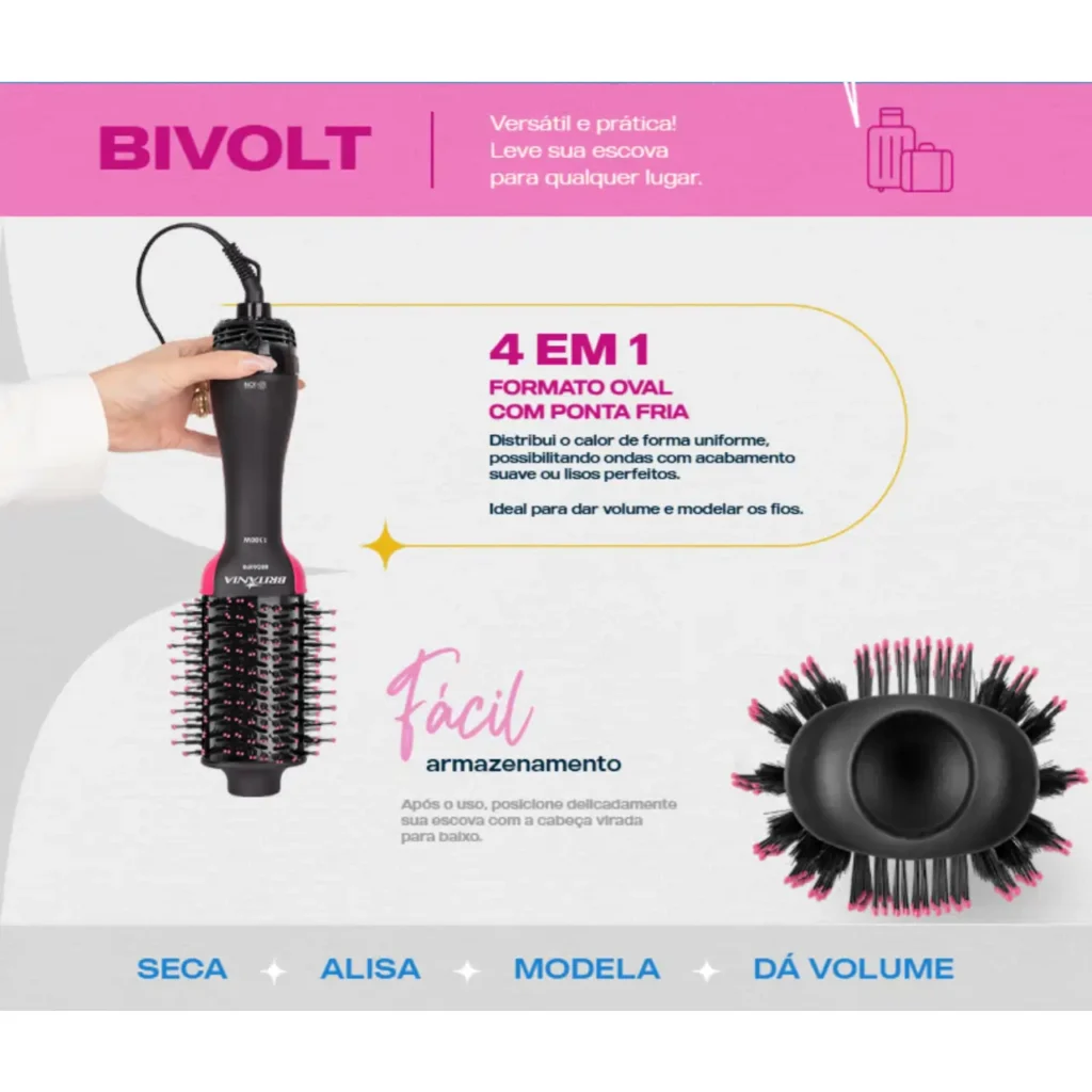 A escova secadora Britânia 4 em 1 BEC02PR é bastante prática devido ao seu design ergonômico e multifuncionalidade. Ela combina secagem, alisamento e modelagem em um único aparelho, facilitando o dia a dia de quem busca eficiência e rapidez nos cuidados capilares.